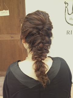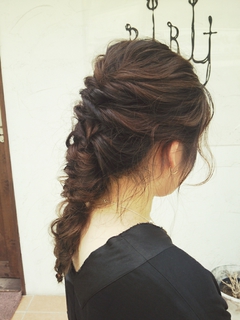 編み込みを織り交ぜたダウンアレンジスタイル。結婚式やパーティー、二次会にオススメです!